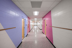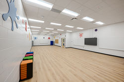 The renovation focused on creating a vibrant, developmentally appropriate environment tailored to young learners. Interiors feature bright, playful color schemes, soft yet durable materials, and abundant natural light to foster a welcoming and engaging atmosphere. Classrooms and shared spaces were redesigned to support flexible learning, integrating areas for STEM exploration, media engagement, and collaborative instruction. A newly reconfigured cafetorium accommodates school gatherings and performances, while the upgraded media center incorporates modern furnishings and digital infrastructure to enhance literacy and technology integration. Both indoor and outdoor play areas were enhanced, including the addition of an indoor soft-play gym equipped with slides, sensory features, and equipment to support physical activity and social-emotional growth.